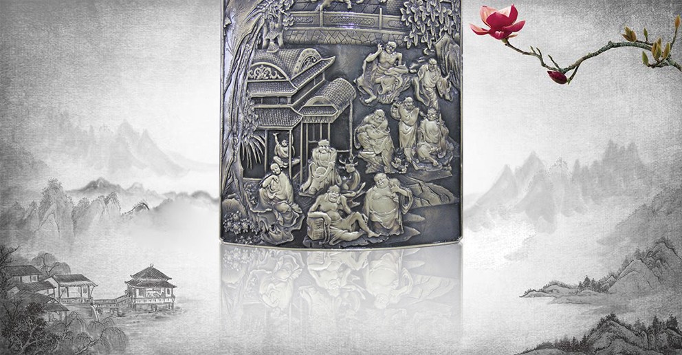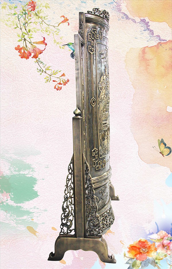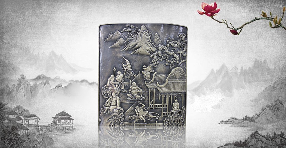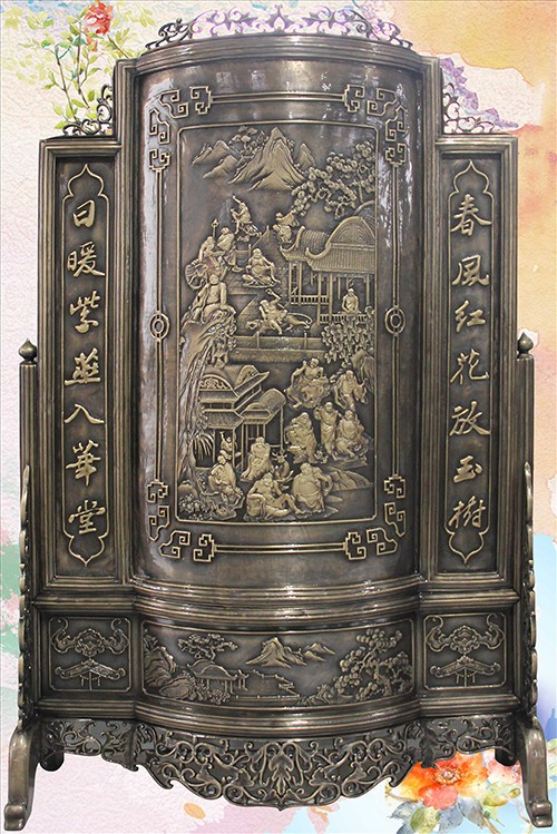 此幅青銅鑄造的《十八羅漢插屏》,是從一友人收藏的大約清中期紅木插屏上翻模制成的。整體上看玲瓏天成,布局精巧。從工藝上看雕法嫻熟,匠心獨具。特別是十八羅漢,個個活靈活現(xiàn)、栩栩如生。作者通過板塊錯落的布局,使畫面生動起來,產(chǎn)生了上乘的視覺效果。
